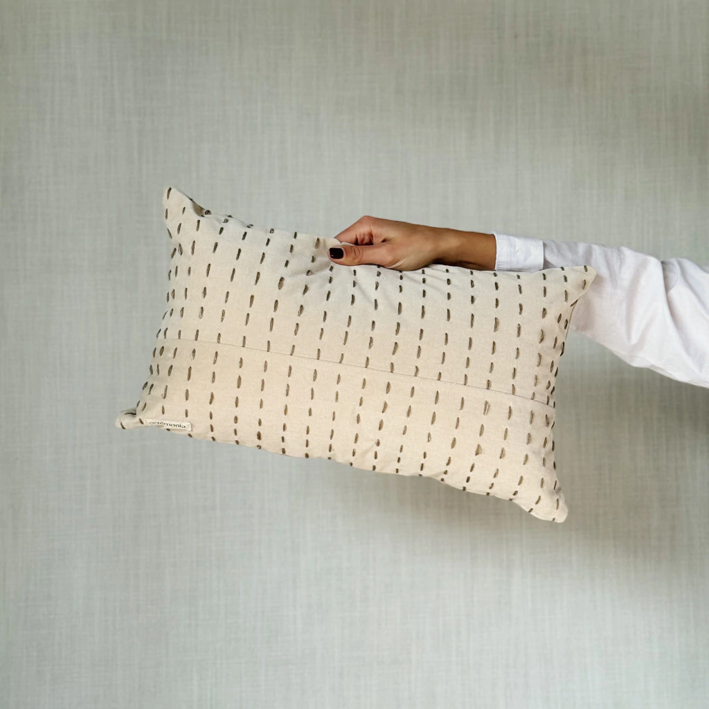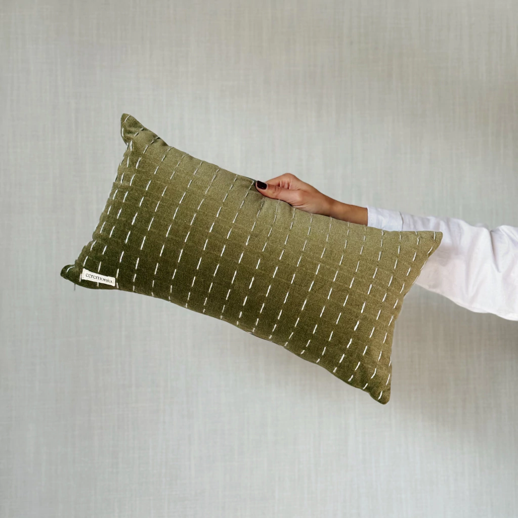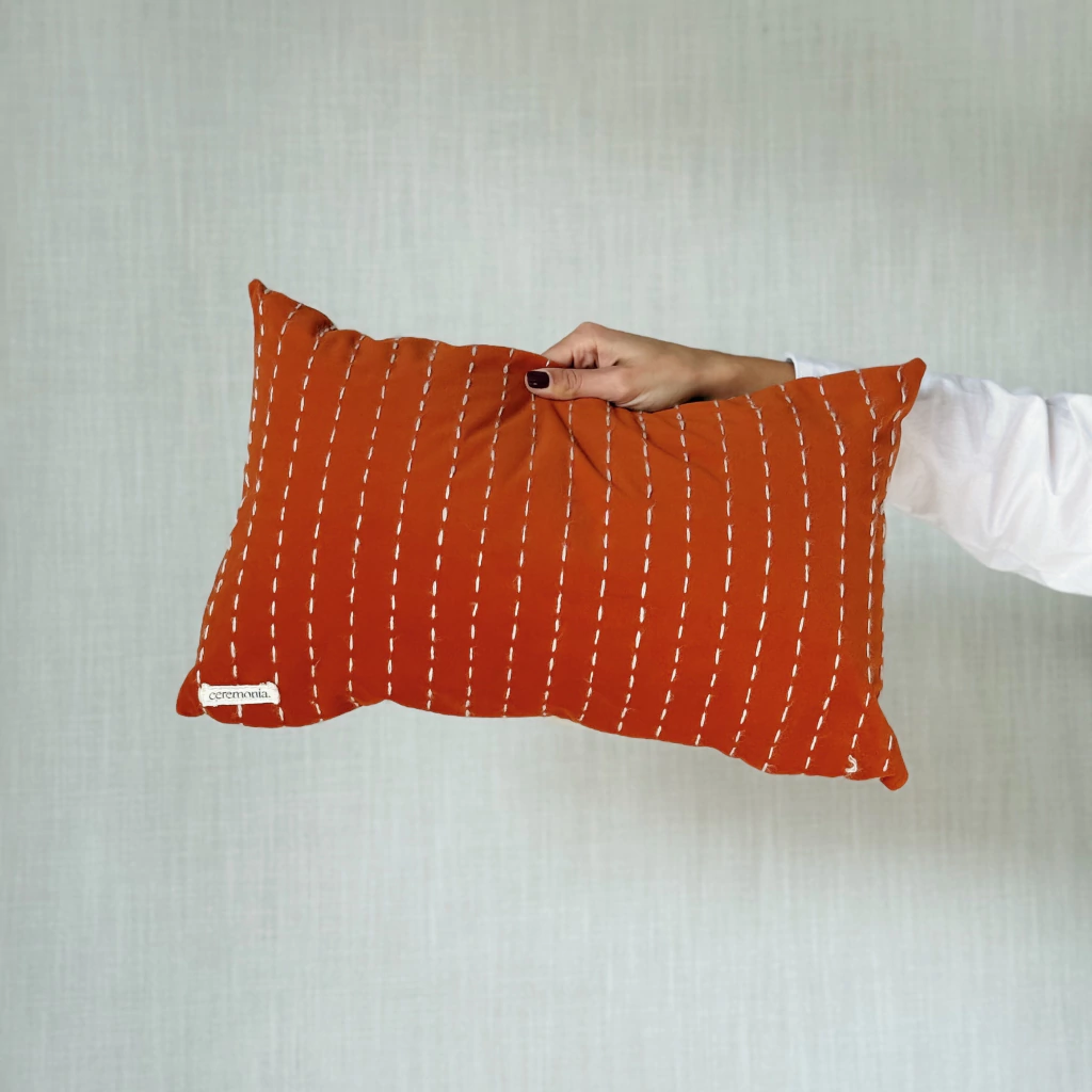 Almohadón con cara de terciopelo con detalles bordados y contracara de tusor, funda lavable y cierre.