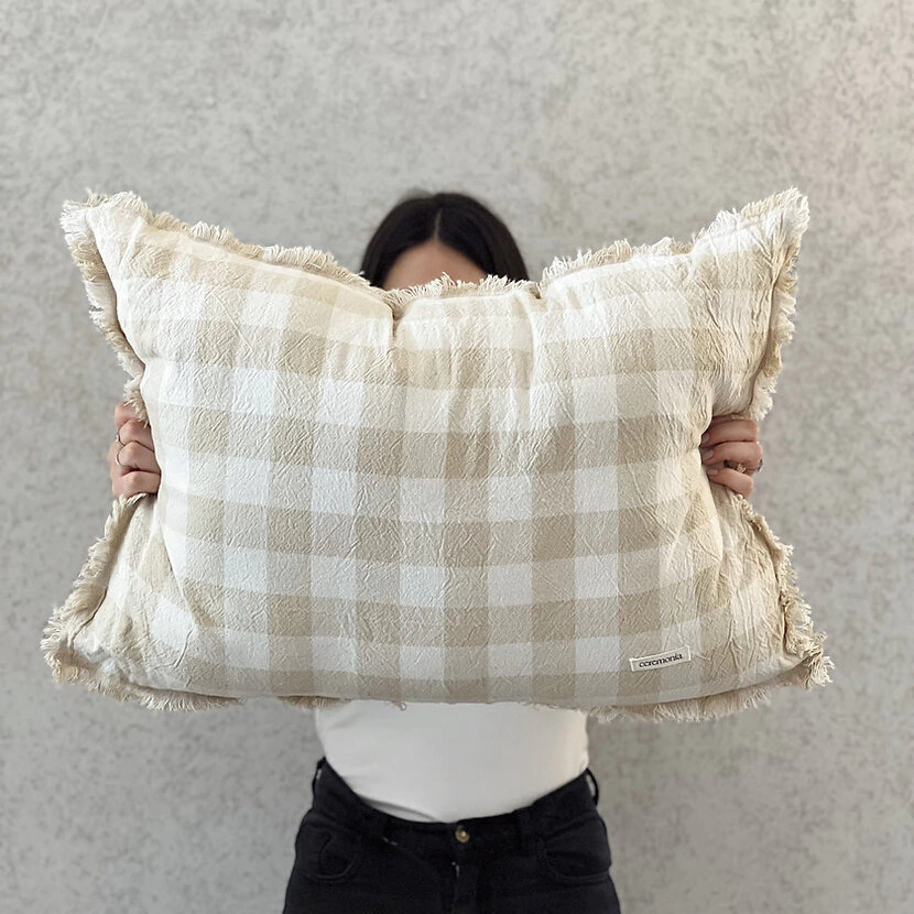 Almohadón de tussor, funda lavable con terminación flecos y cierre.