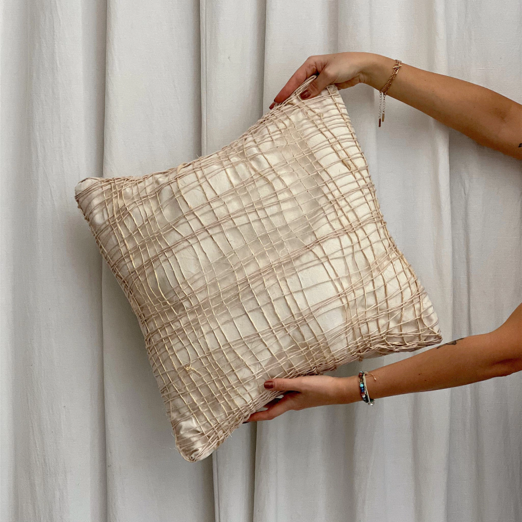 Almohadón de tusor con frente en sisal. Relleno de vellón siliconado independiente.