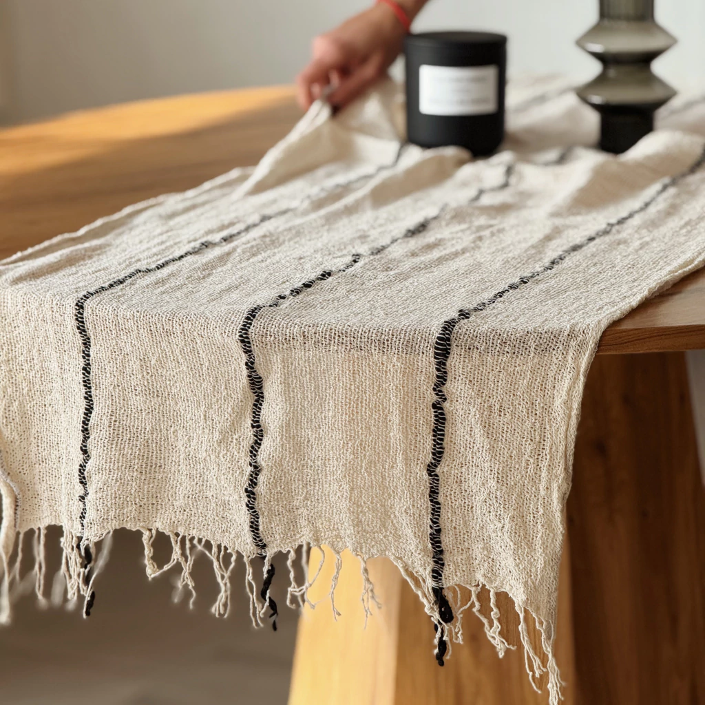 Camino de mesa tejido tropical con rayas negras