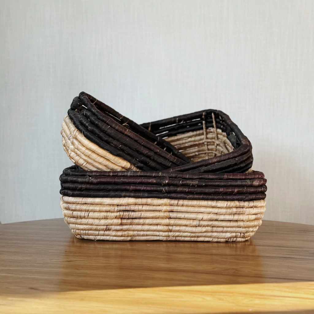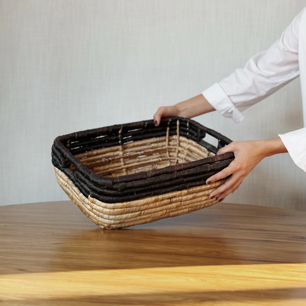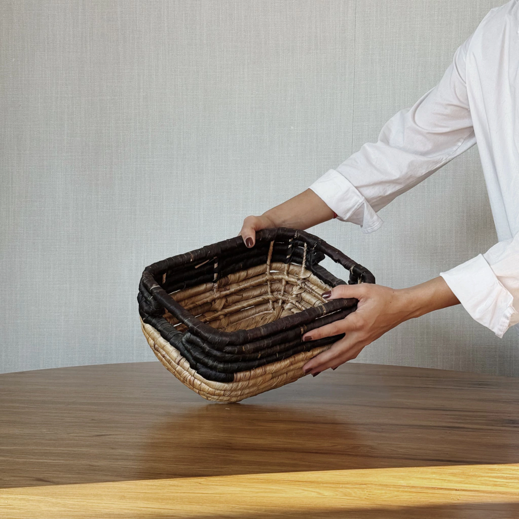 Canasta realizada en Water Hyacinth, con estructura rígida.