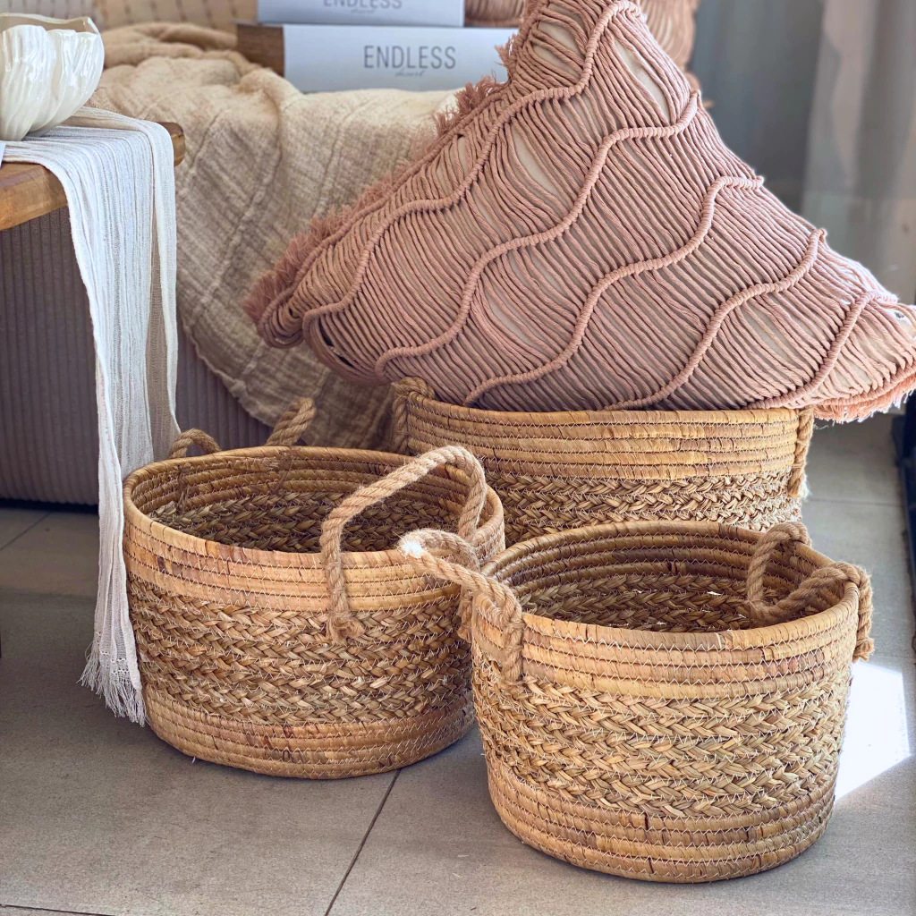 Canasto rígido artesanal de fibras naturales en natural con diferentes tramas y texturas, con asas.