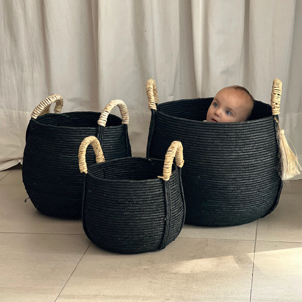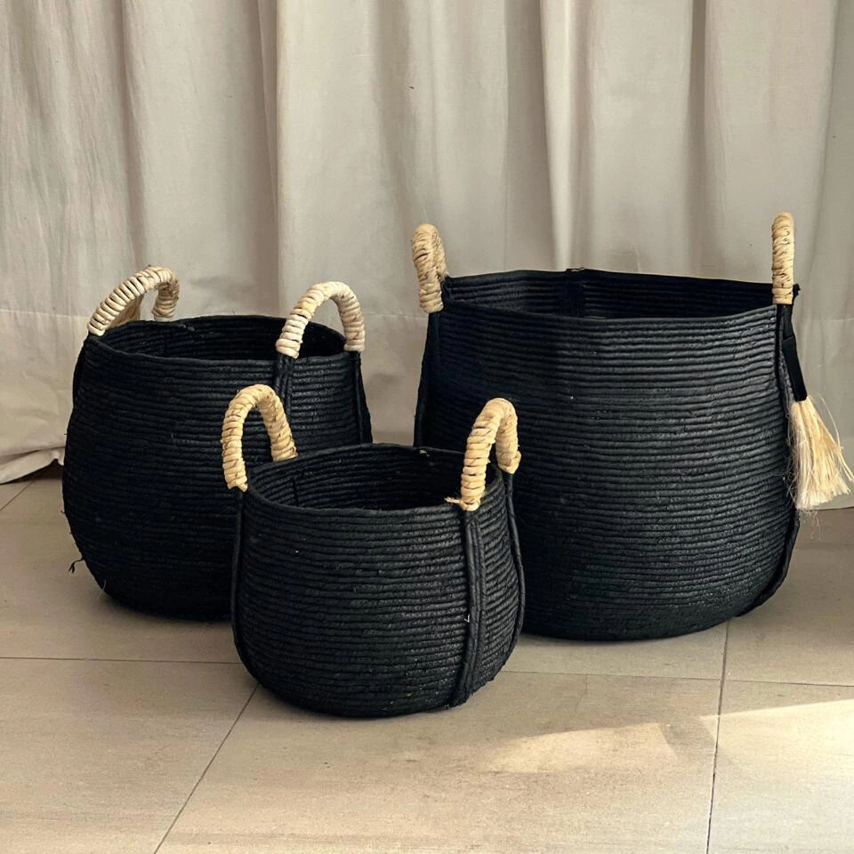 Canasto rígido artesanal de fibras naturales en color negro, con asas.