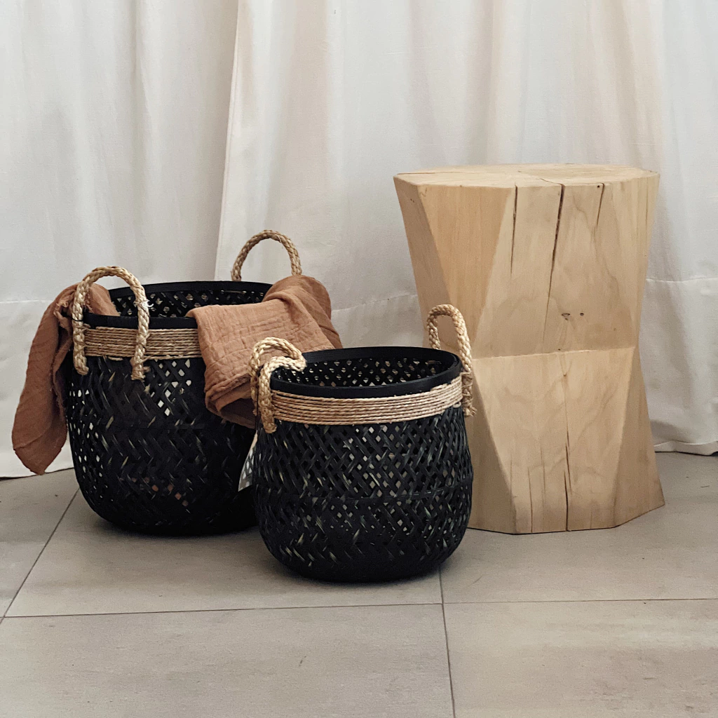 Canasto rígido artesanal de fibras naturales en color negro, con asas.