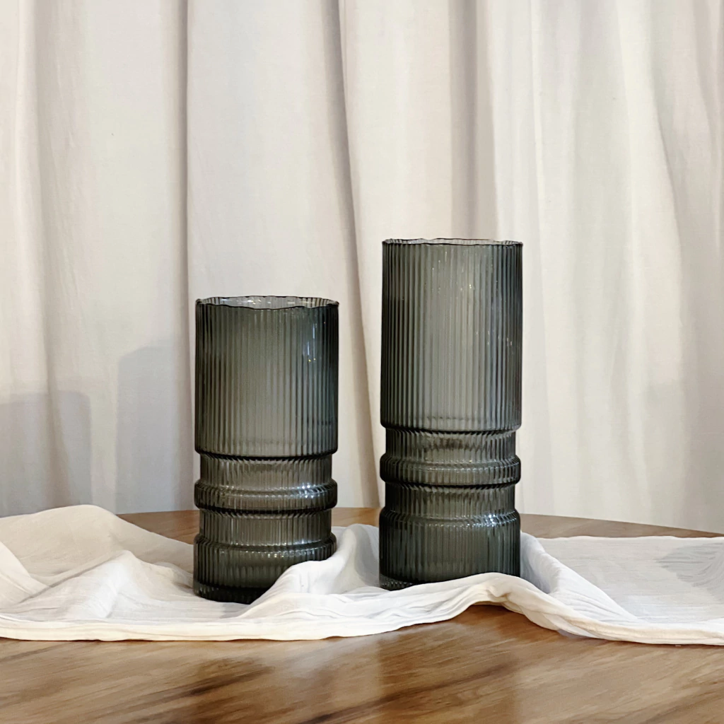 Florero decorativo de vidrio texturado color gris humo.