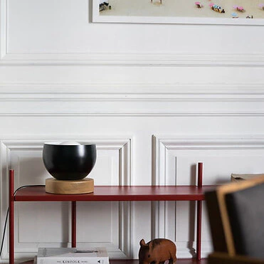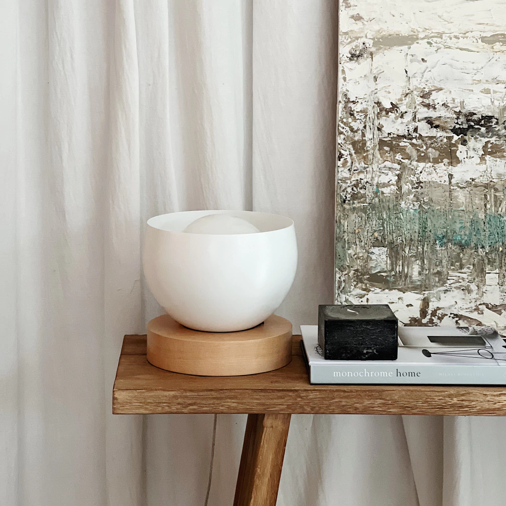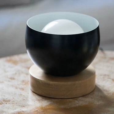 Lámpara con base de madera y esfera de aluminio con globo de vidrio opal. Porta lampara apto para lamparas E27.