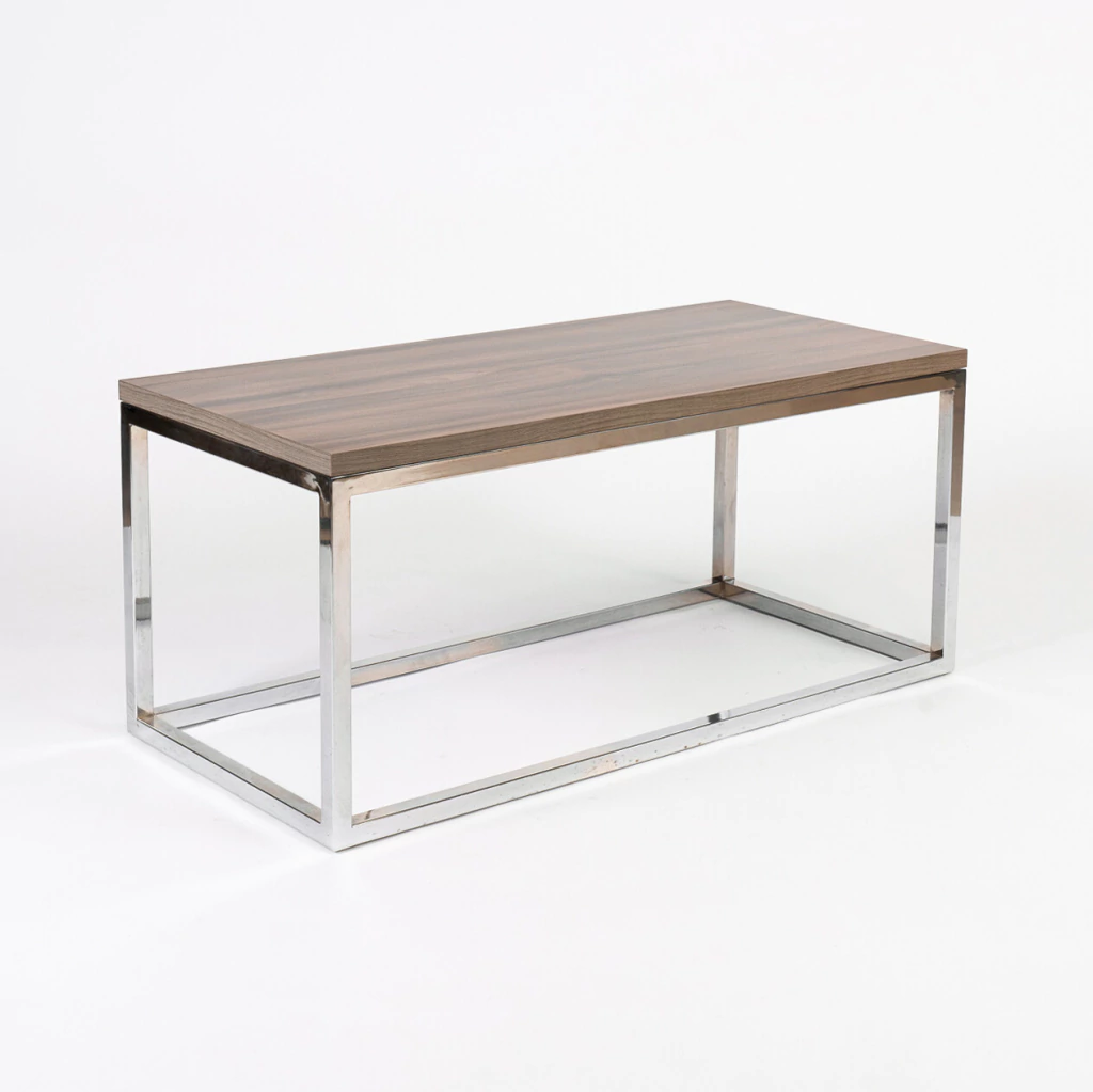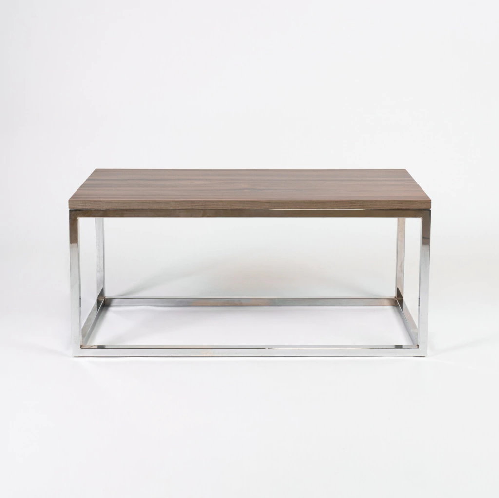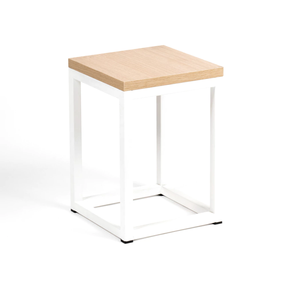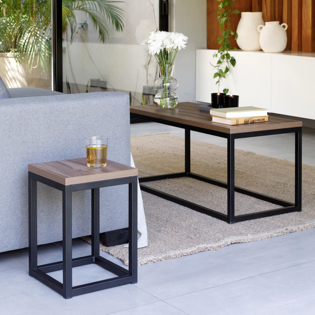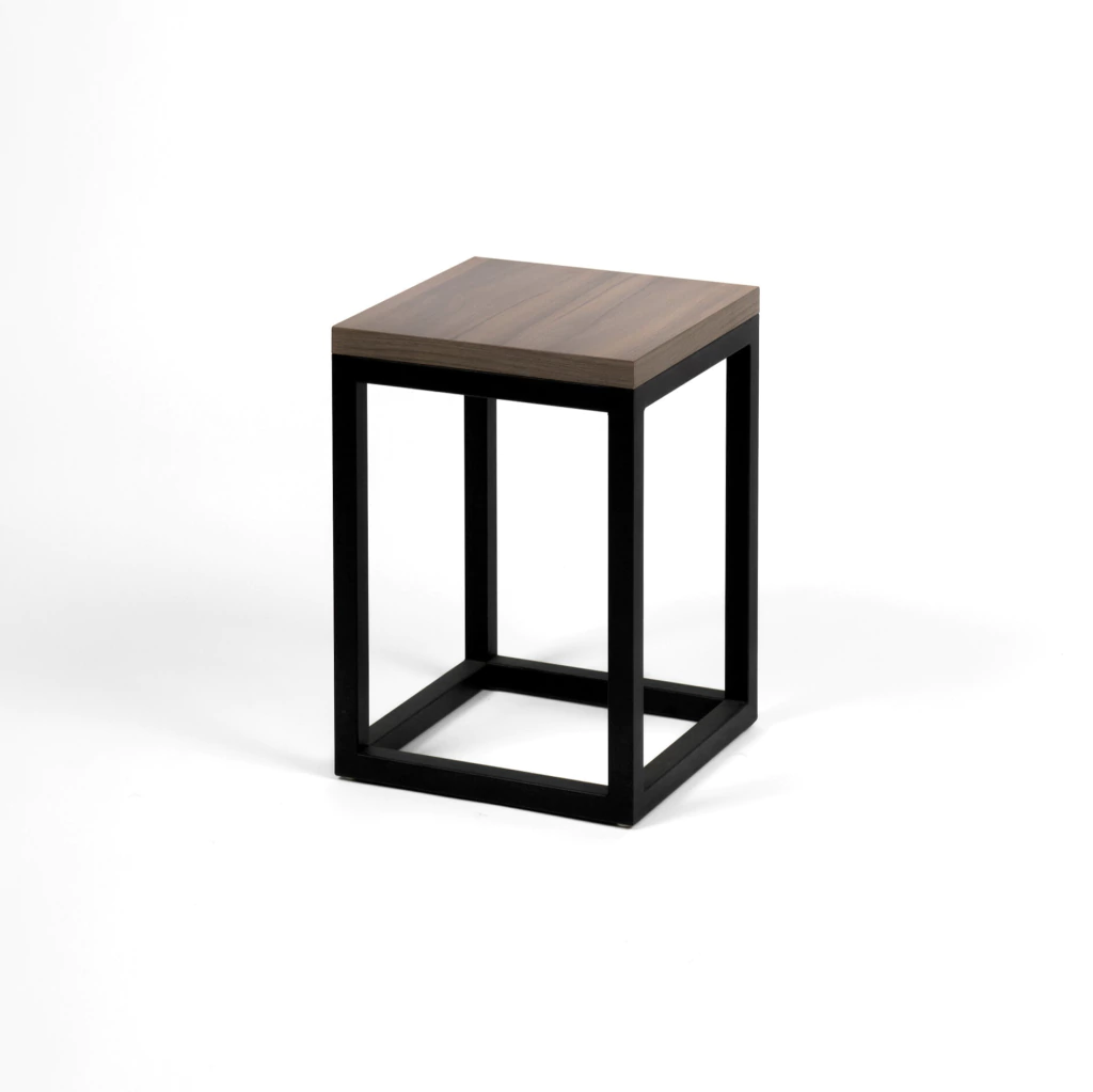 Mesa baja cerezo, con base de caño 25mm x 25mm, con terminación epoxi a fuego, color blanco o negro, o cromada.