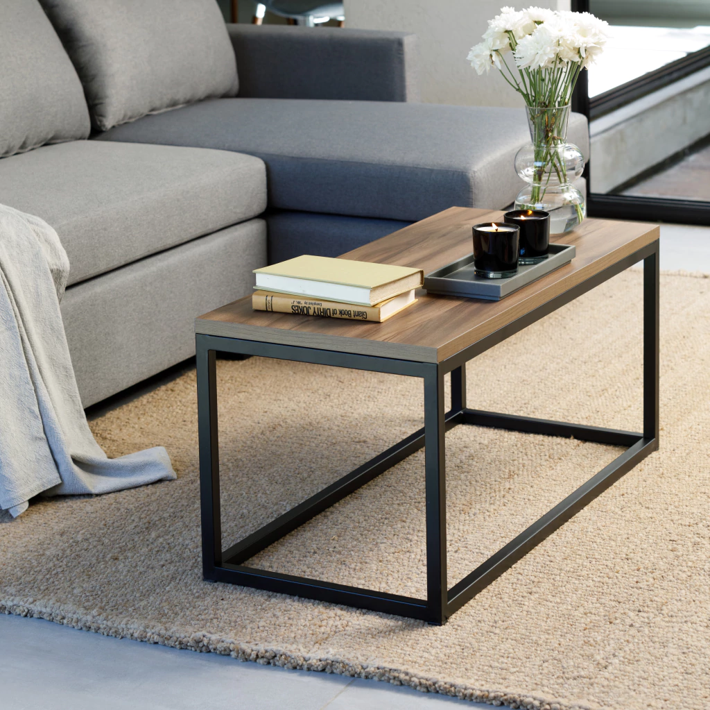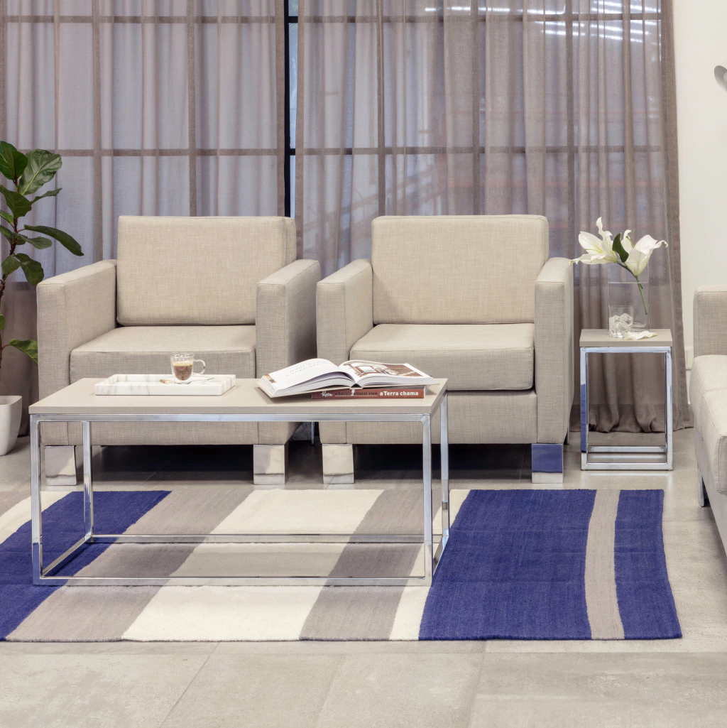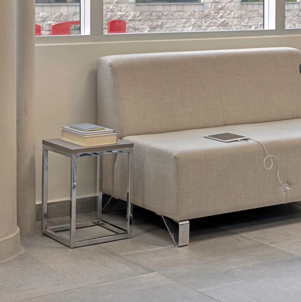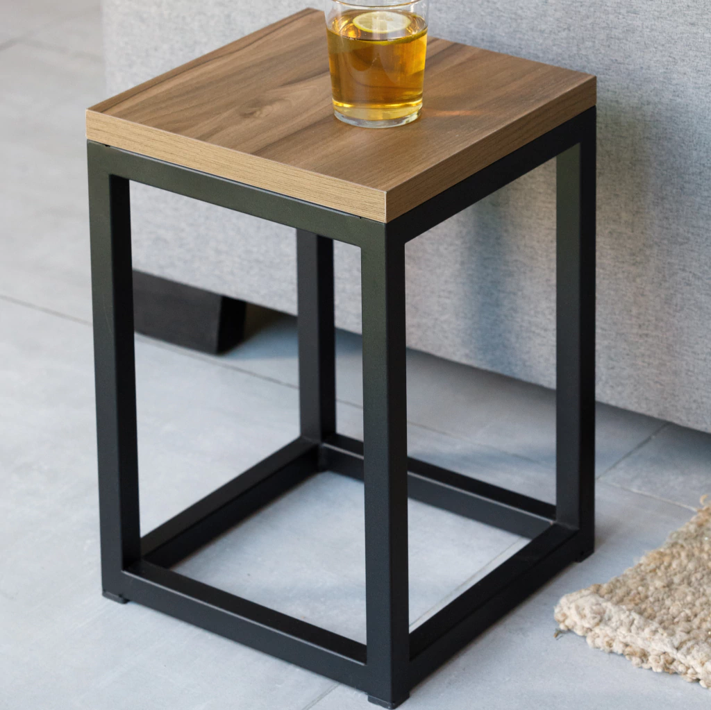 Mesa baja cerezo, con base de caño 25mm x 25mm, con terminación epoxi a fuego, color blanco o negro, o cromada.