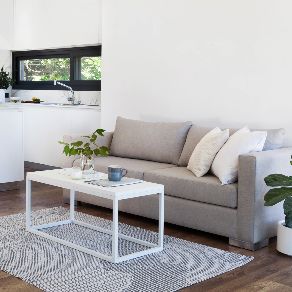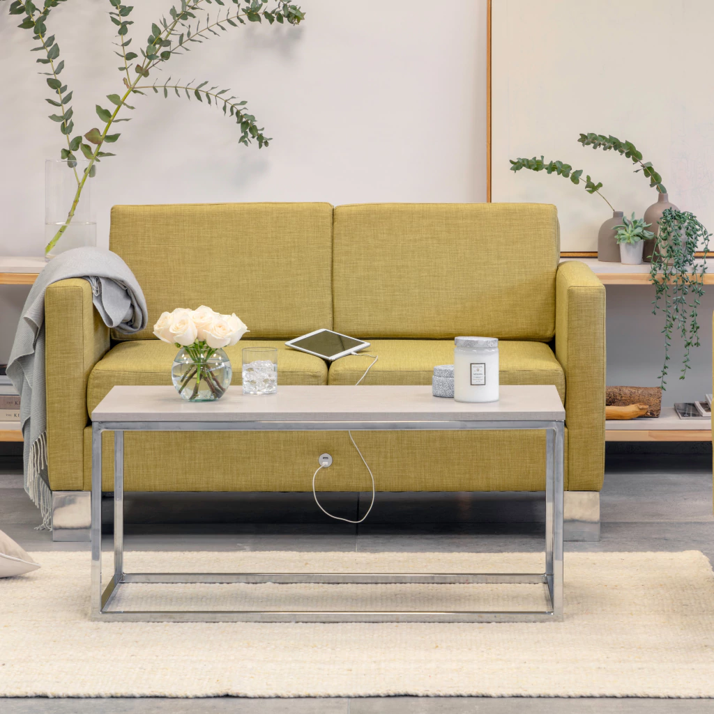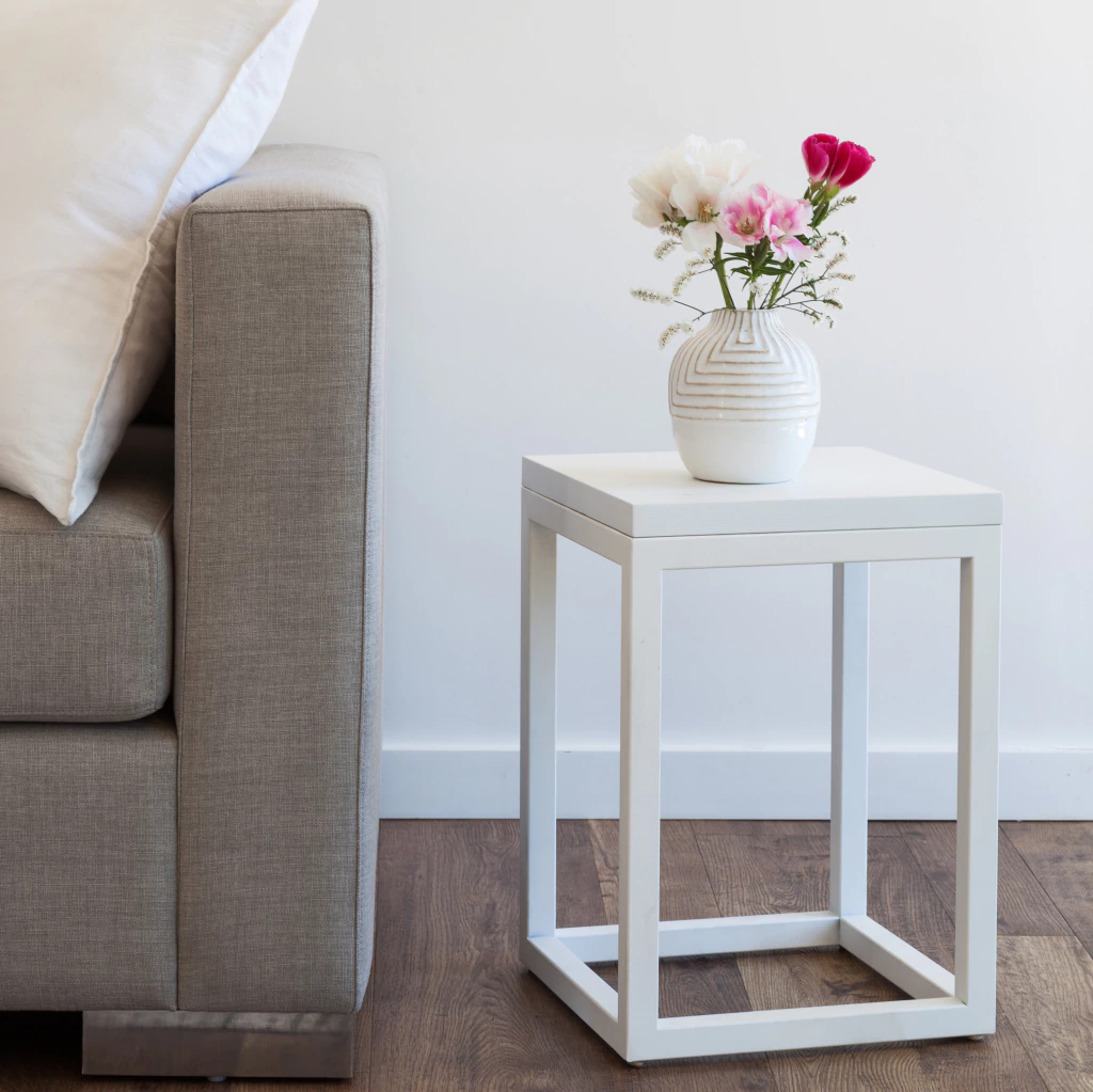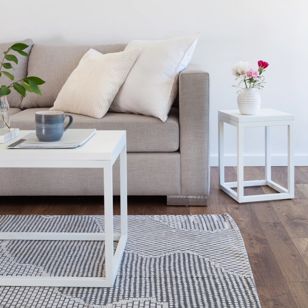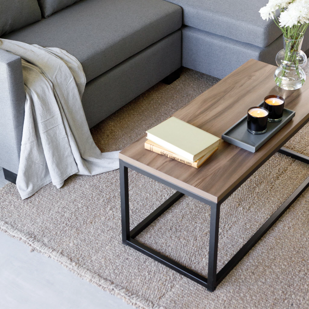 Mesa baja cerezo, con base de caño 25mm x 25mm, con terminación epoxi a fuego, color blanco o negro, o cromada.