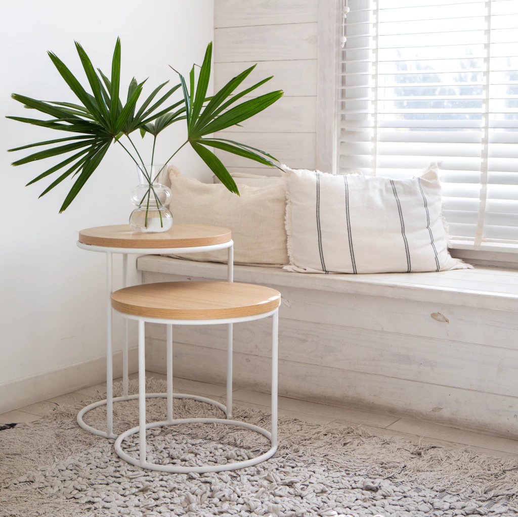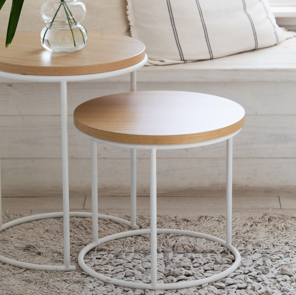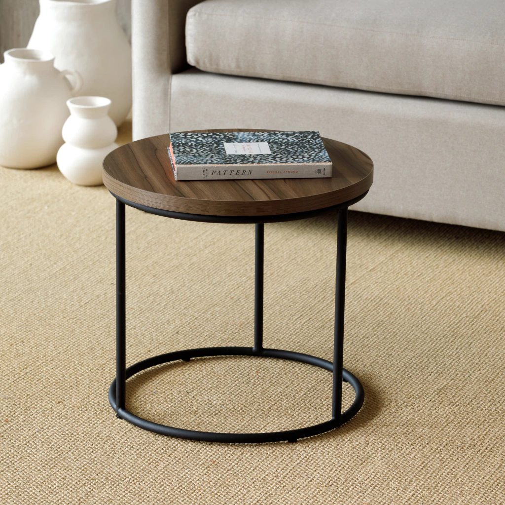Mesa baja tipo nido con base de caño circular con terminación epoxi microtexturado en negro, negro o cromado y con tapa en melamina nogal terracota, blanco nature o roble americano.