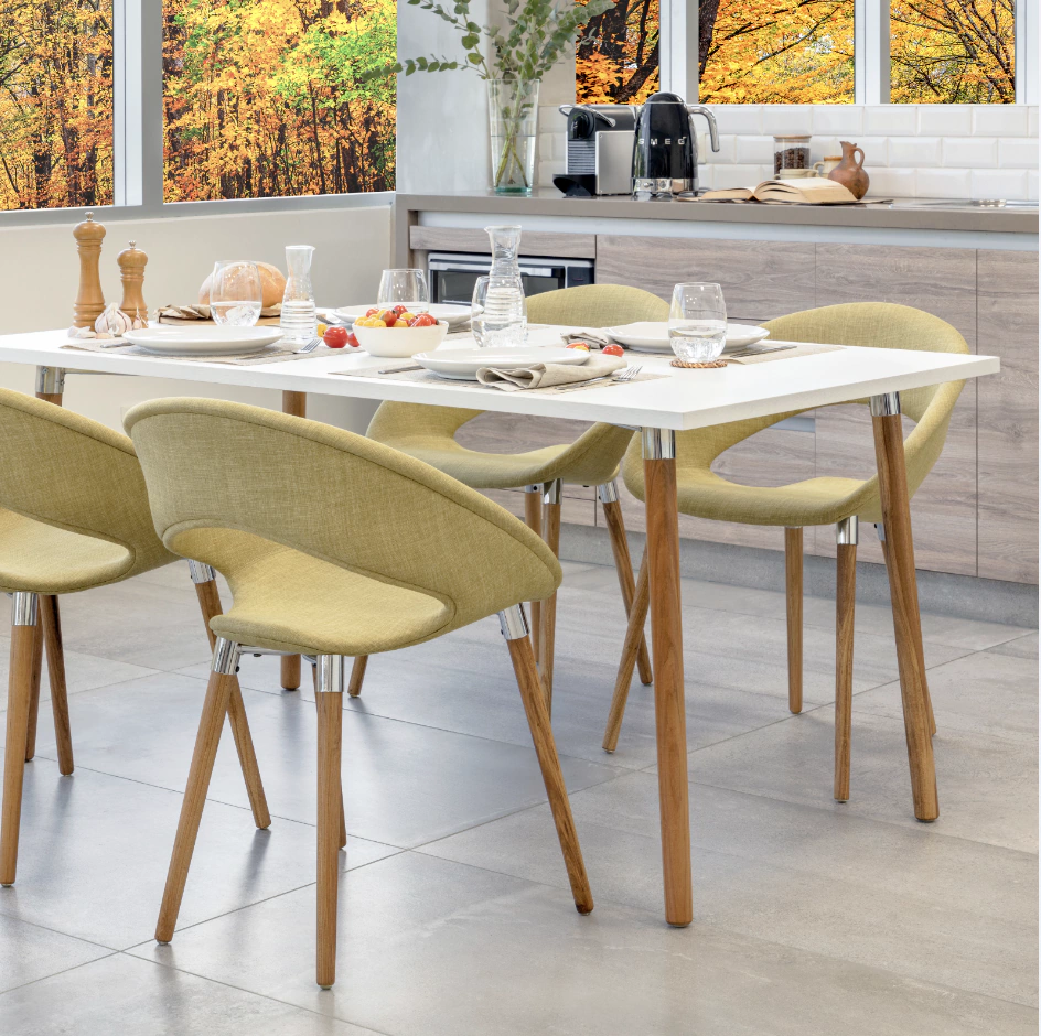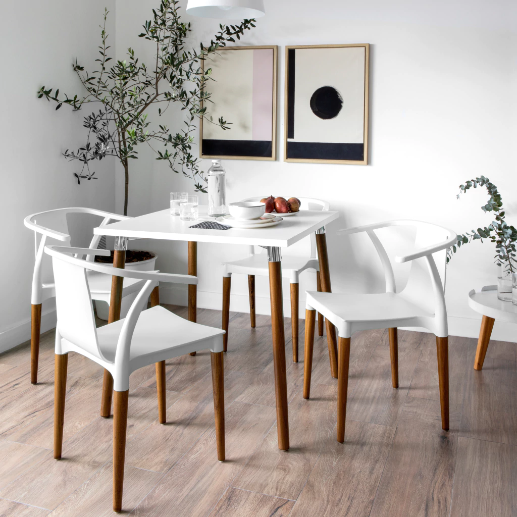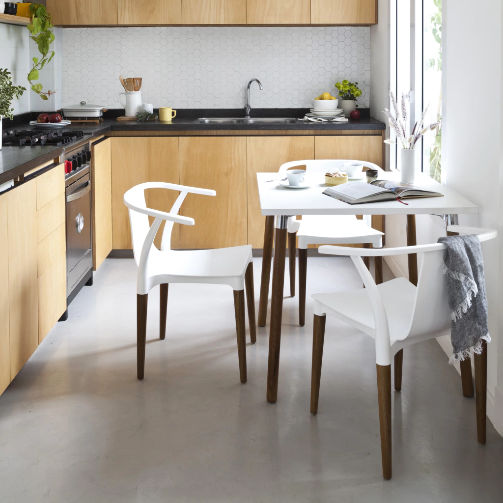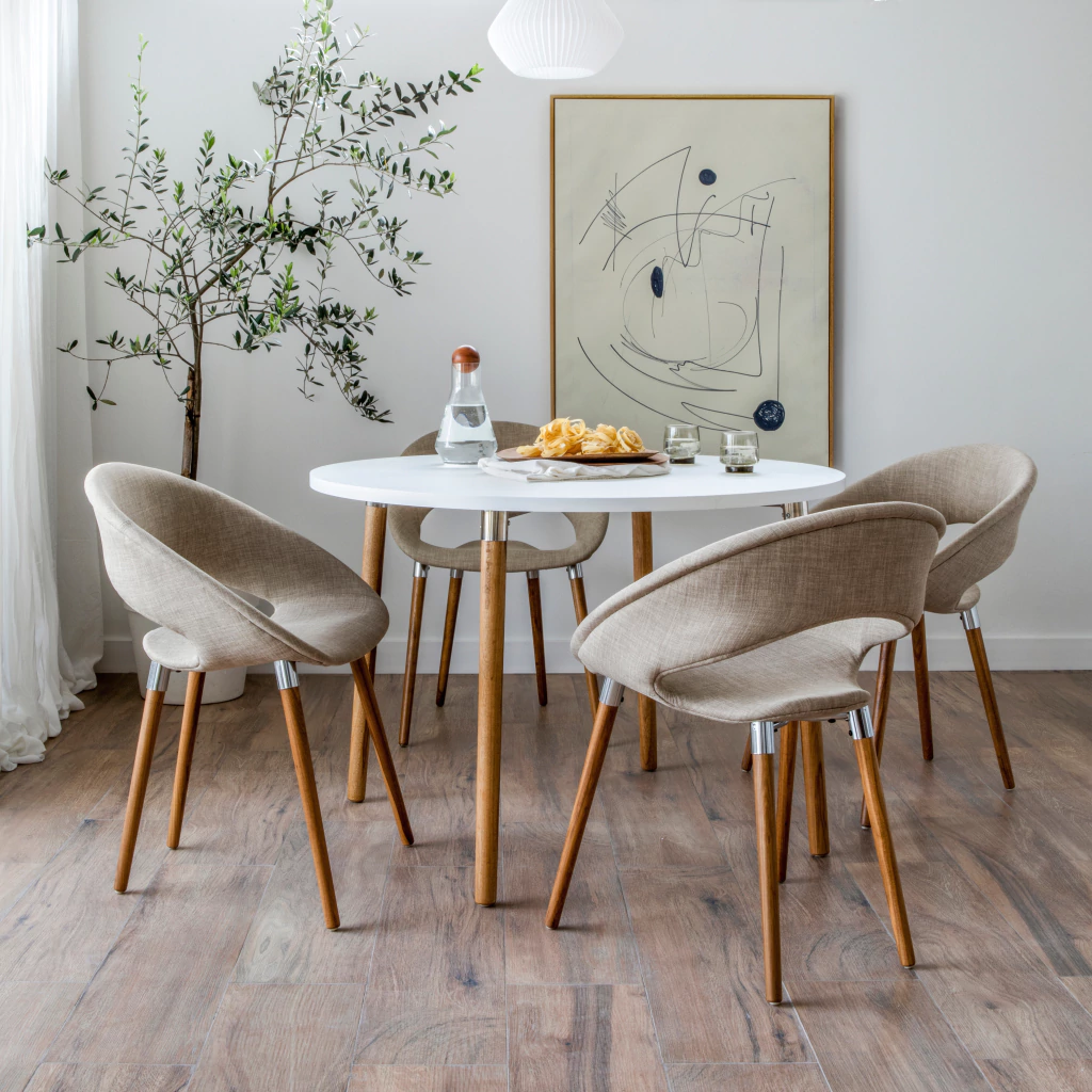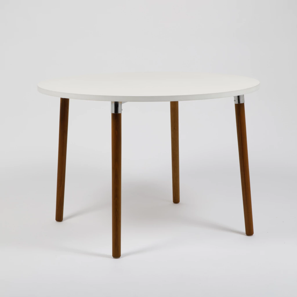 Mesa Camelia, con patas en madera maciza de petiribí, detalles en hierro cromado y tapa en melamina blanca Nature de 36mm