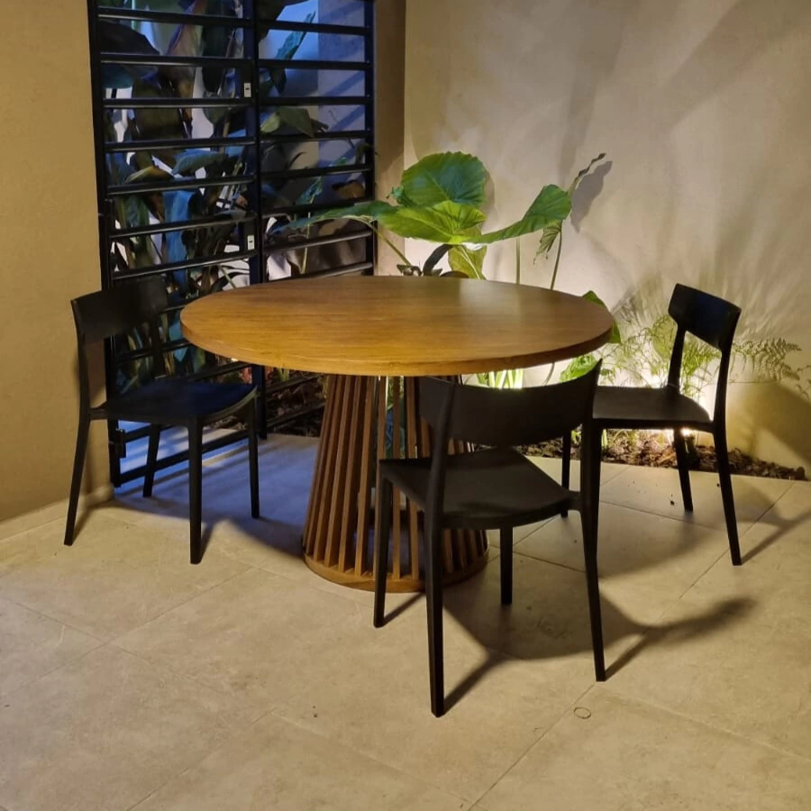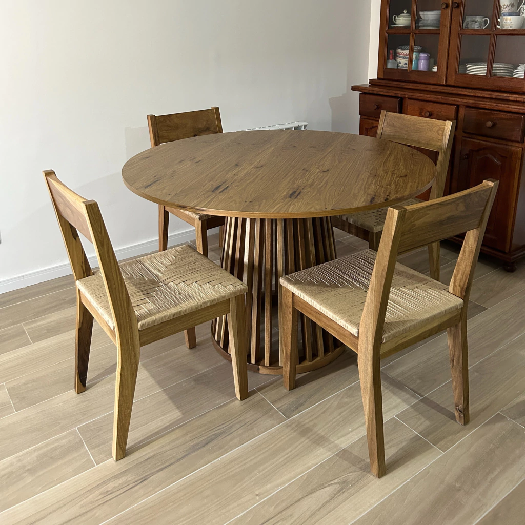 La tapa está realizada en MDF de 20mm enchapado en petiribí y la base es de varillas macizas de petiribí.