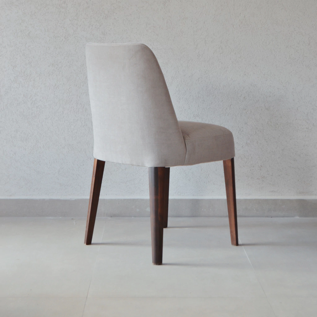 Elegante silla de diseño tapizada con patas de madera maciza de paraíso con terminación en laca poliuretánica. Podés elegir dentro de 6 alternativas de lustre.