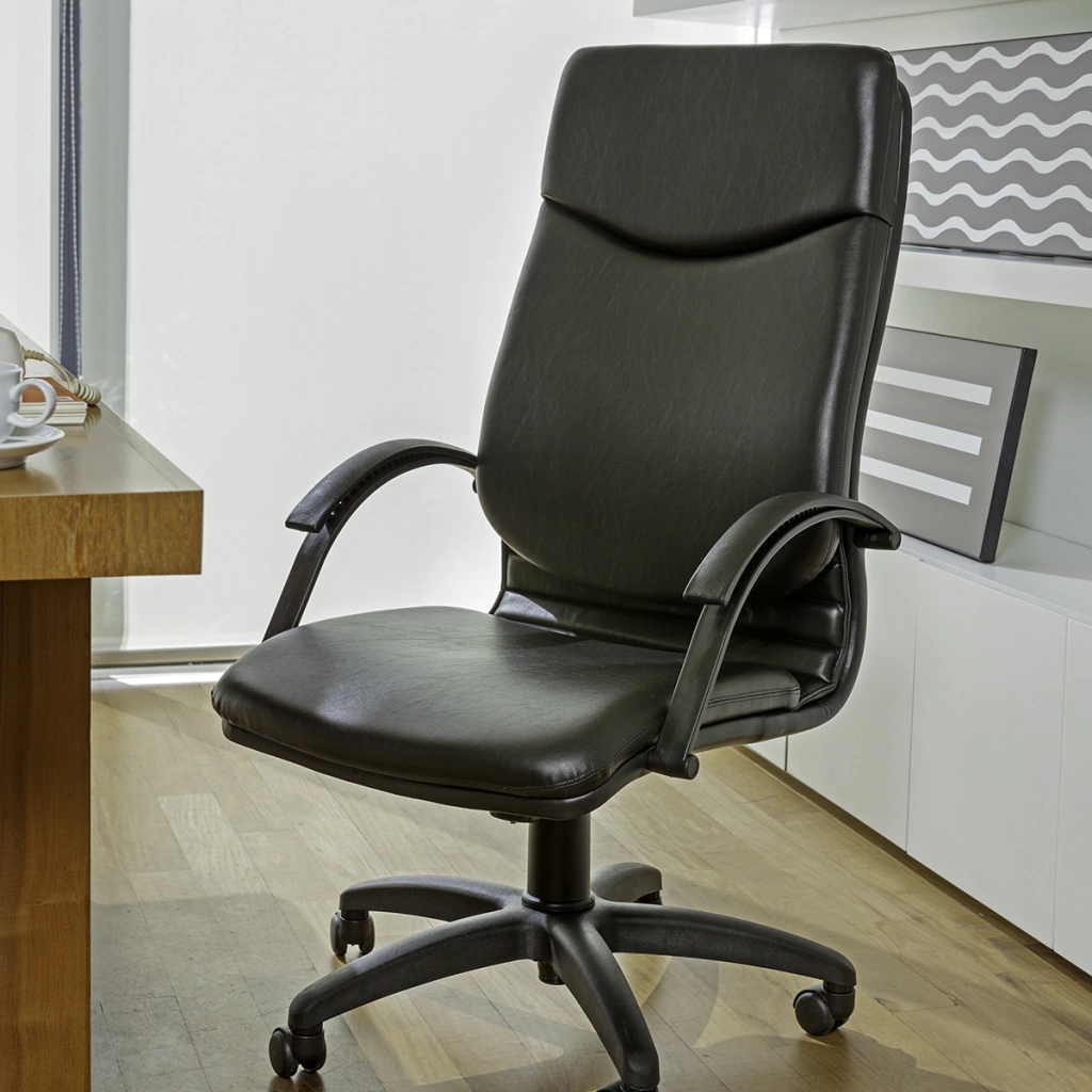 Sillón gerencial tapizado en ecocuero Negro con brazos fijos.