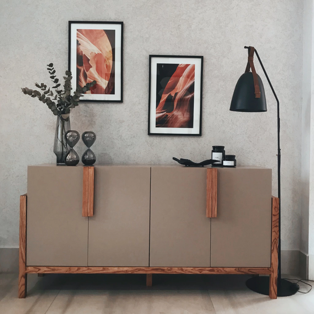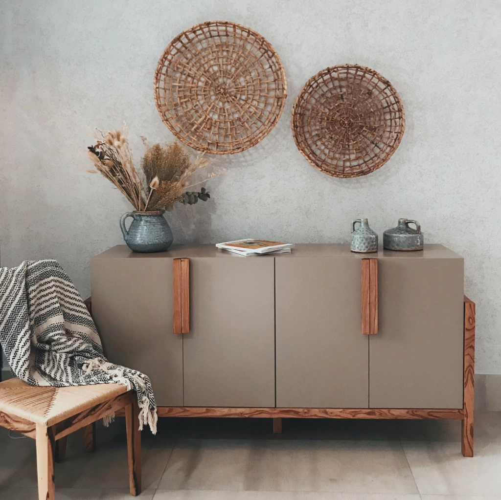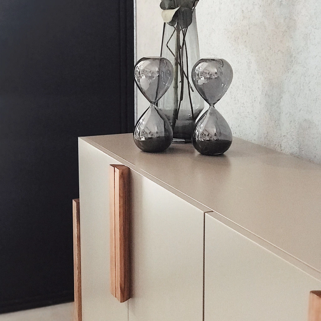 Vajillero Senza realizado en madera de Paraíso. La estructura y los tiradores son de madera maciza y el cuerpo del mueble puede ser enchapado en paraíso o en MDF laqueado. Ofrecemos 6 colores de laca para que puedas elegir.