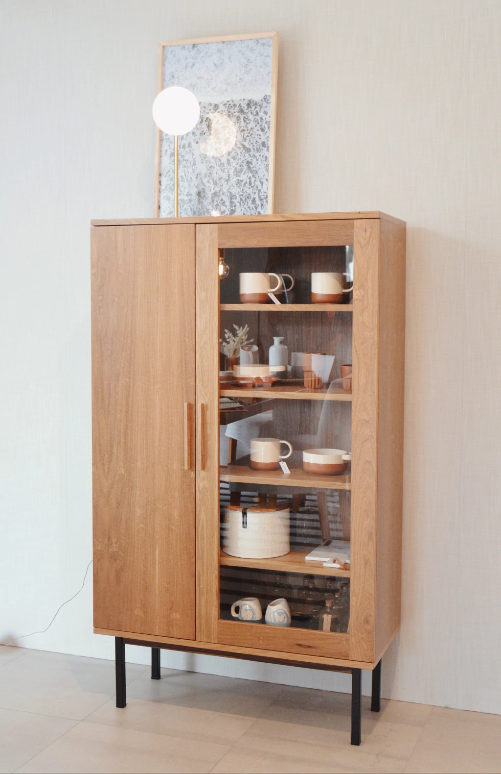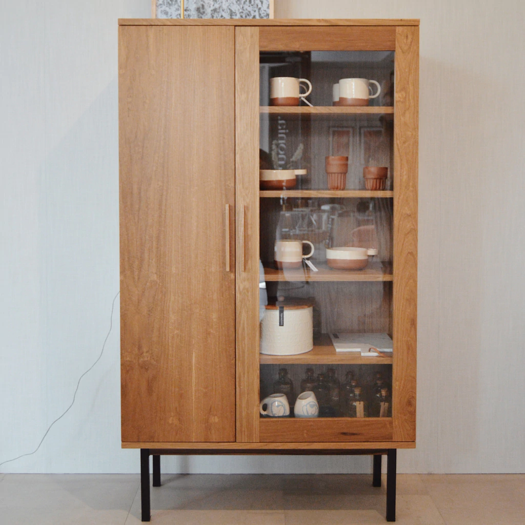 Vajillero realizado en MDF enchapado en Petiribí, terminación laca al agua.Tiene una puerta ciega, y la otra con frente vidriadio.
