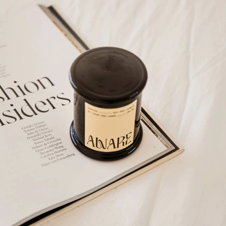 Vela de cera de soja 100%. Envase de vidrio ámbar con tapa.