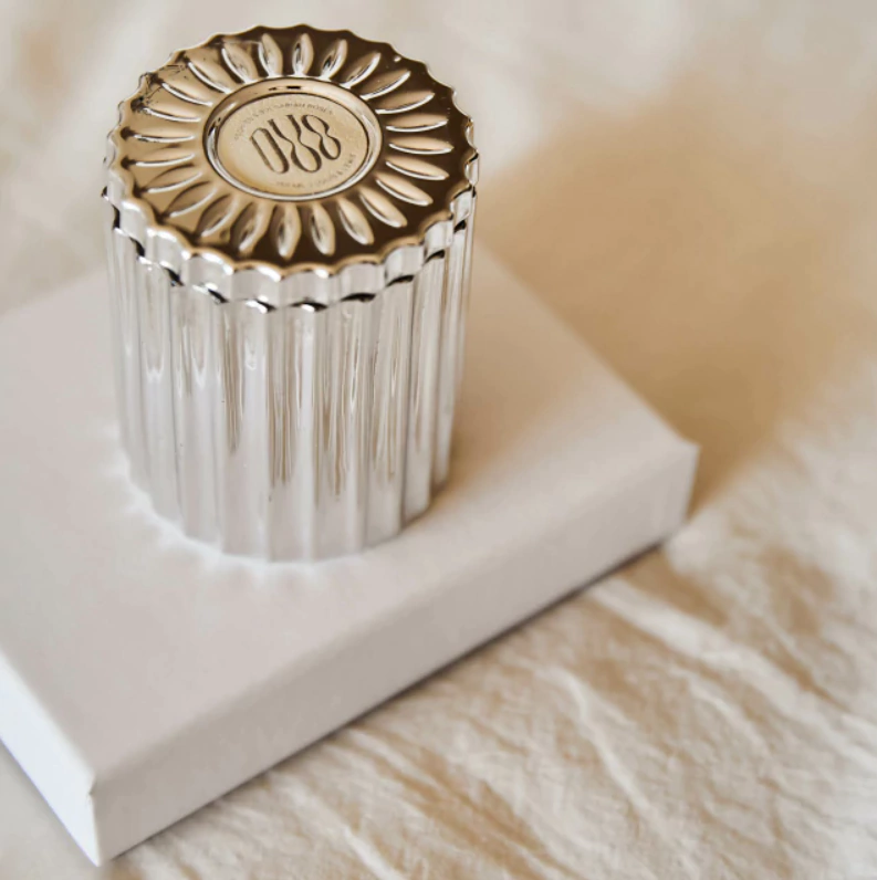 Vela de cera de soja 100%. Envase de vidrio plateado con tapa.